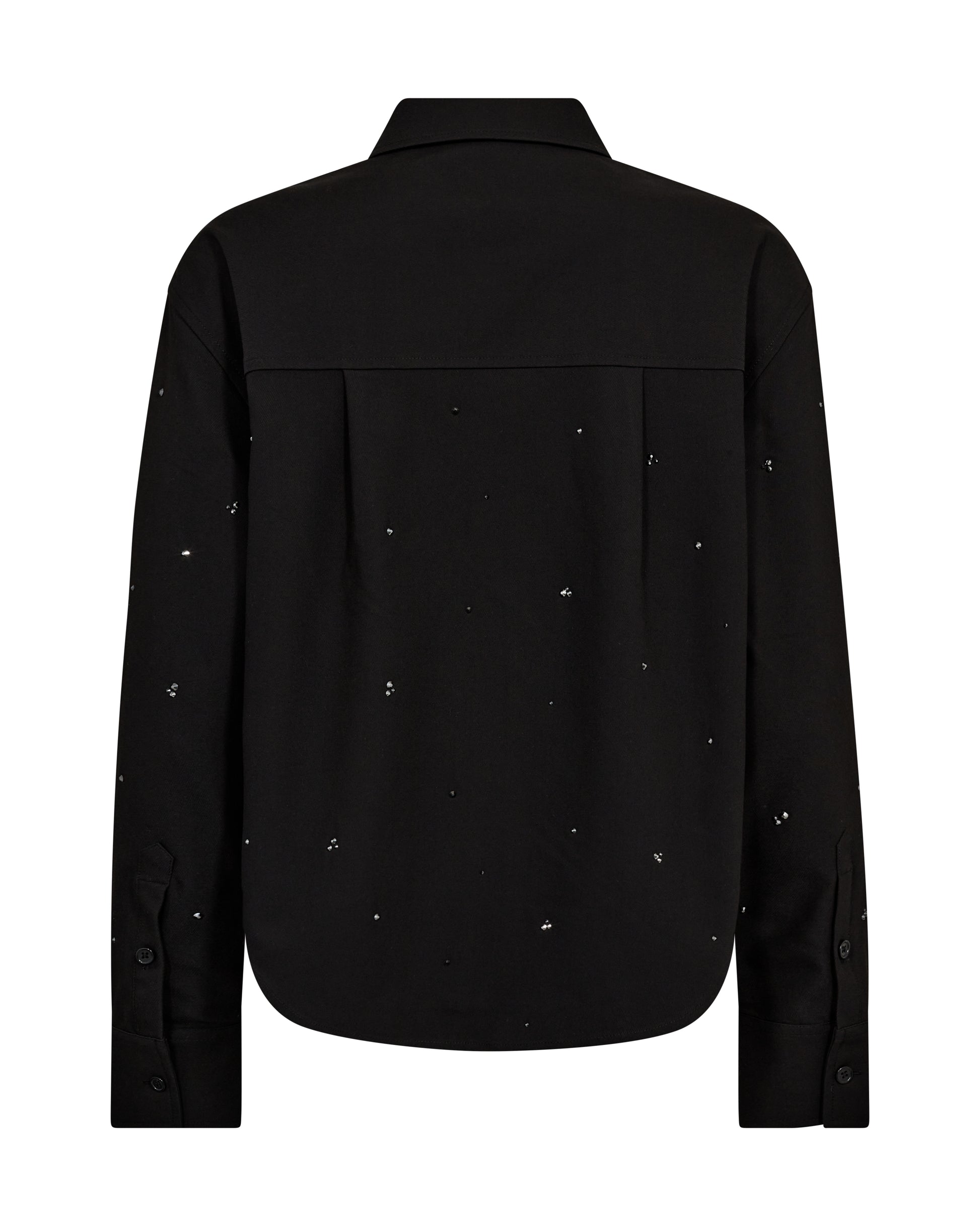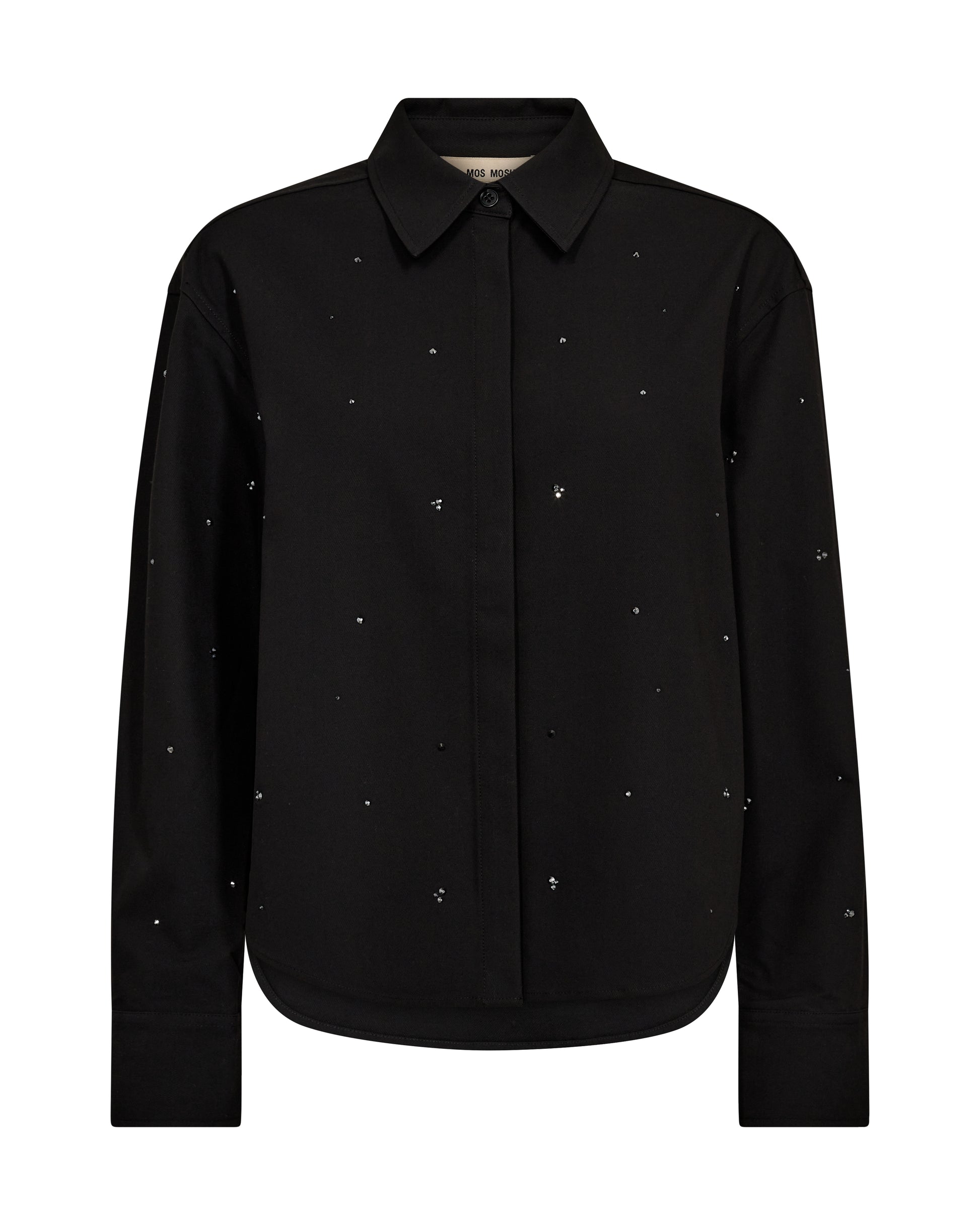 This shirt is a refined essential with a glamorous twist. Crafted in a crisp black fabric, it’s cut in a slightly boxy silhouette with a sharp collar and concealed button placket for a clean, polished look. Delicate crystal embellishments are scattered across the surface, catching the light and adding a subtle sparkle that elevates any outfit. Style it with tailored trousers for a sophisticated ensemble, or wear it with denim for a chic contrast. A timeless piece with that signature MOS MOSH shine.