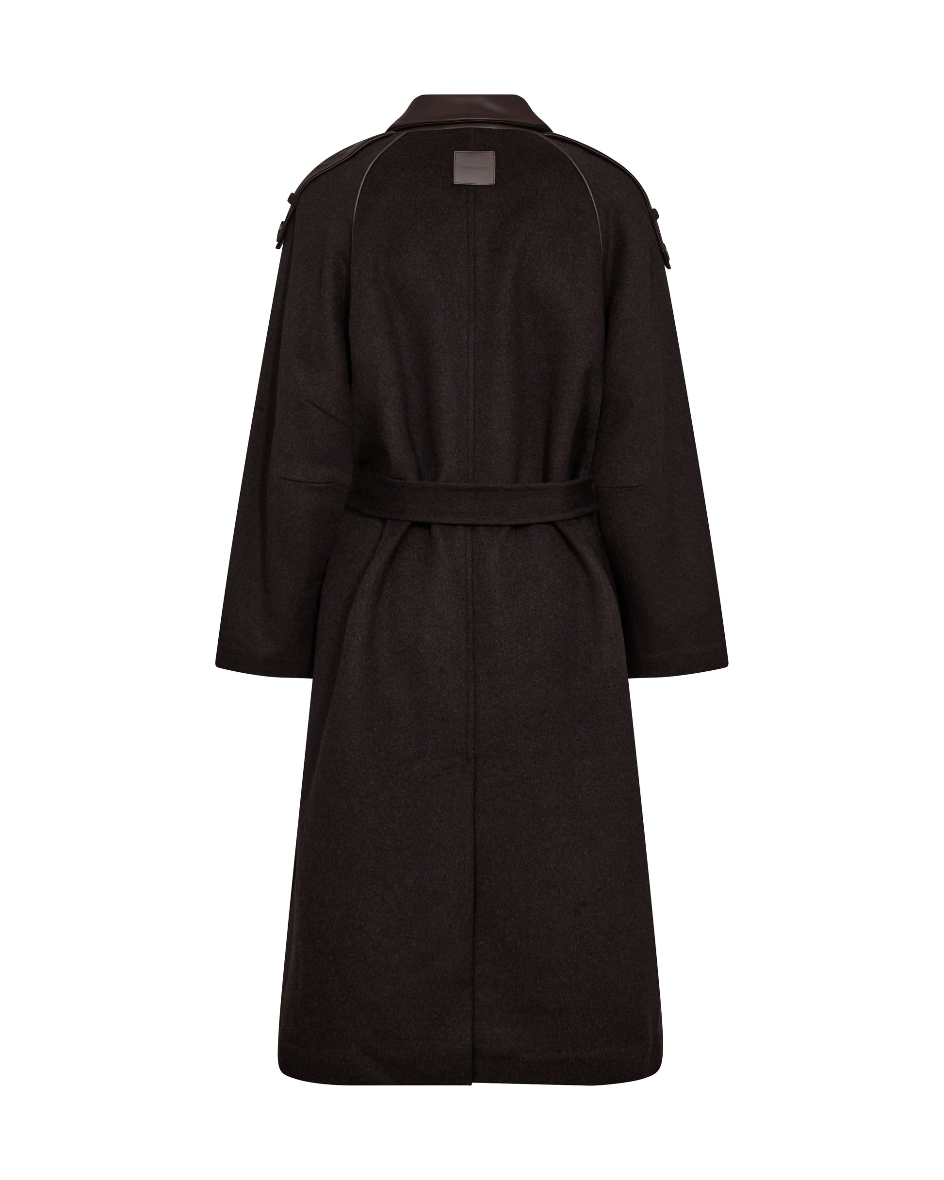 This elegant wool coat combines timeless design with refined details, featuring a classic collar, long sleeves, and a concealed button closure for a sleek look. Leather accents at the collar, pockets, and shoulder strap buttons add a sophisticated edge, while the matching belt defines the silhouette. With its long length and regular fit, this coat is a versatile statement piece that blends warmth, style, and luxury.