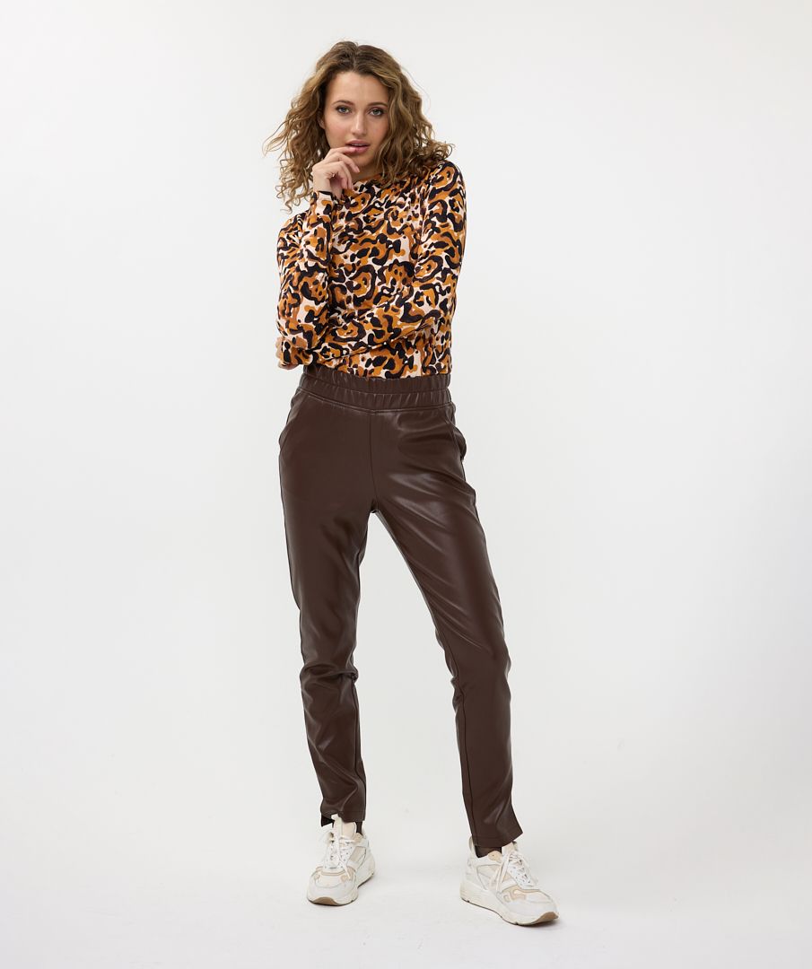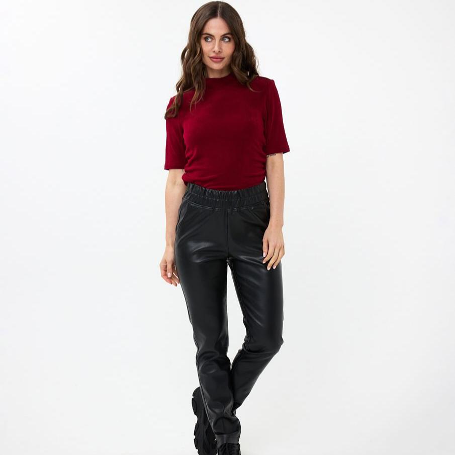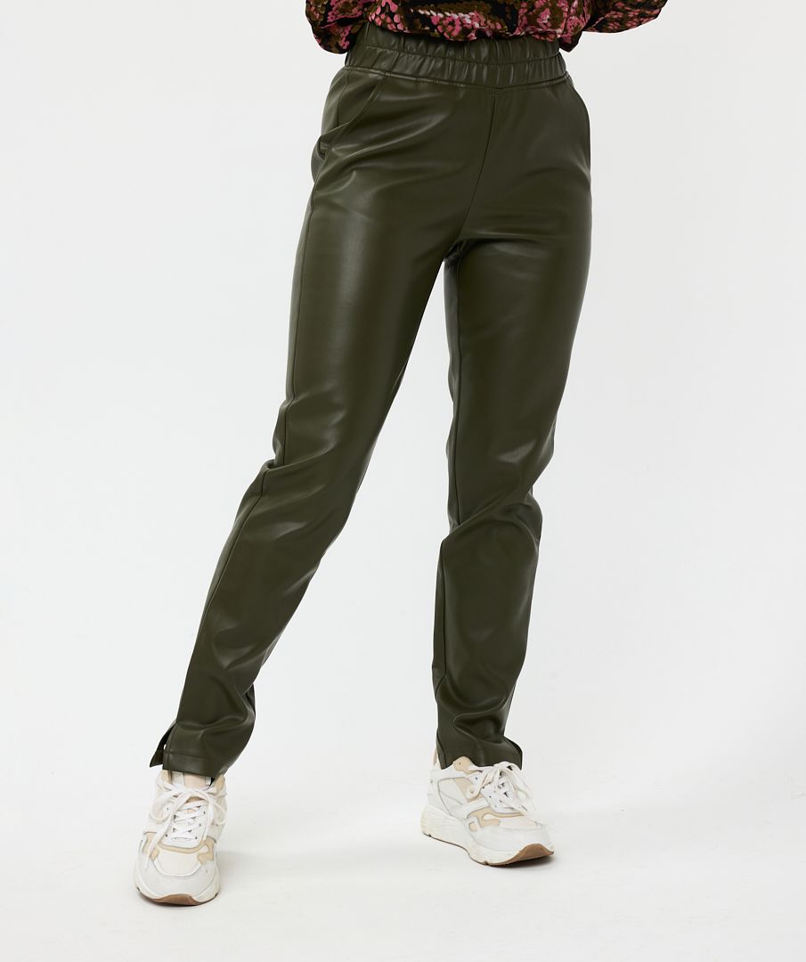 Comfortable vegan leather tregging. This cool tregging has a comfortable fit due to the slightly loose fit, elastic waistband and slit at the bottom of the pant legs.