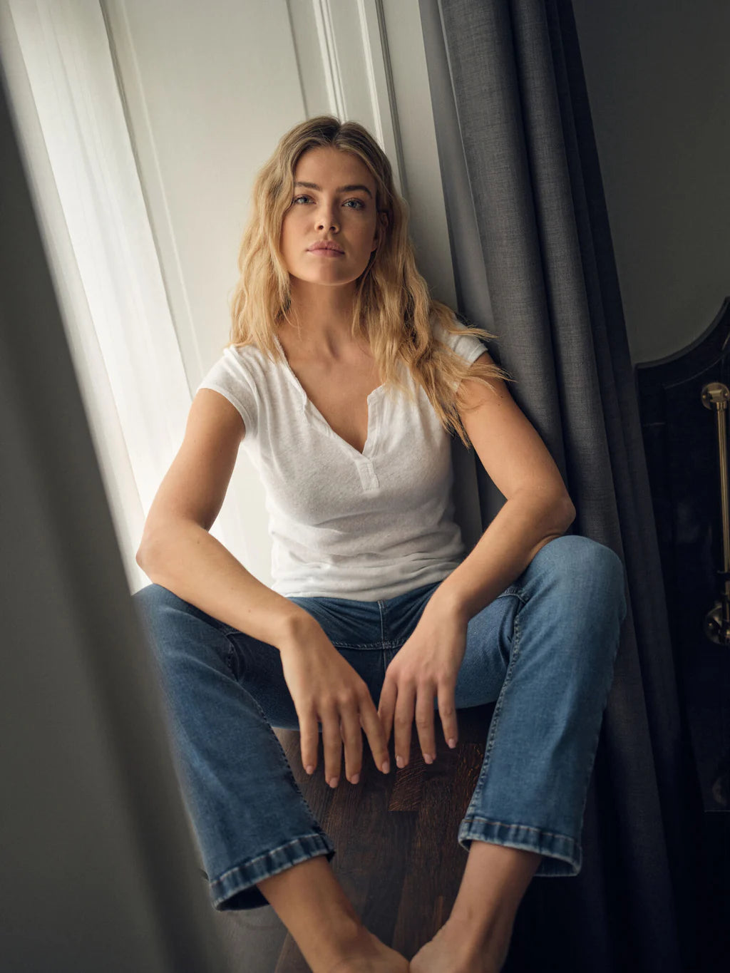 A timeless MOS MOSH favourite, this soft cotton-linen tee is designed in a relaxed fit with a flattering V-neckline. The feminine placket detail and roll-edge sleeves add a casual yet refined touch. Perfect for pairing with jeans or tailoring for effortless everyday style.